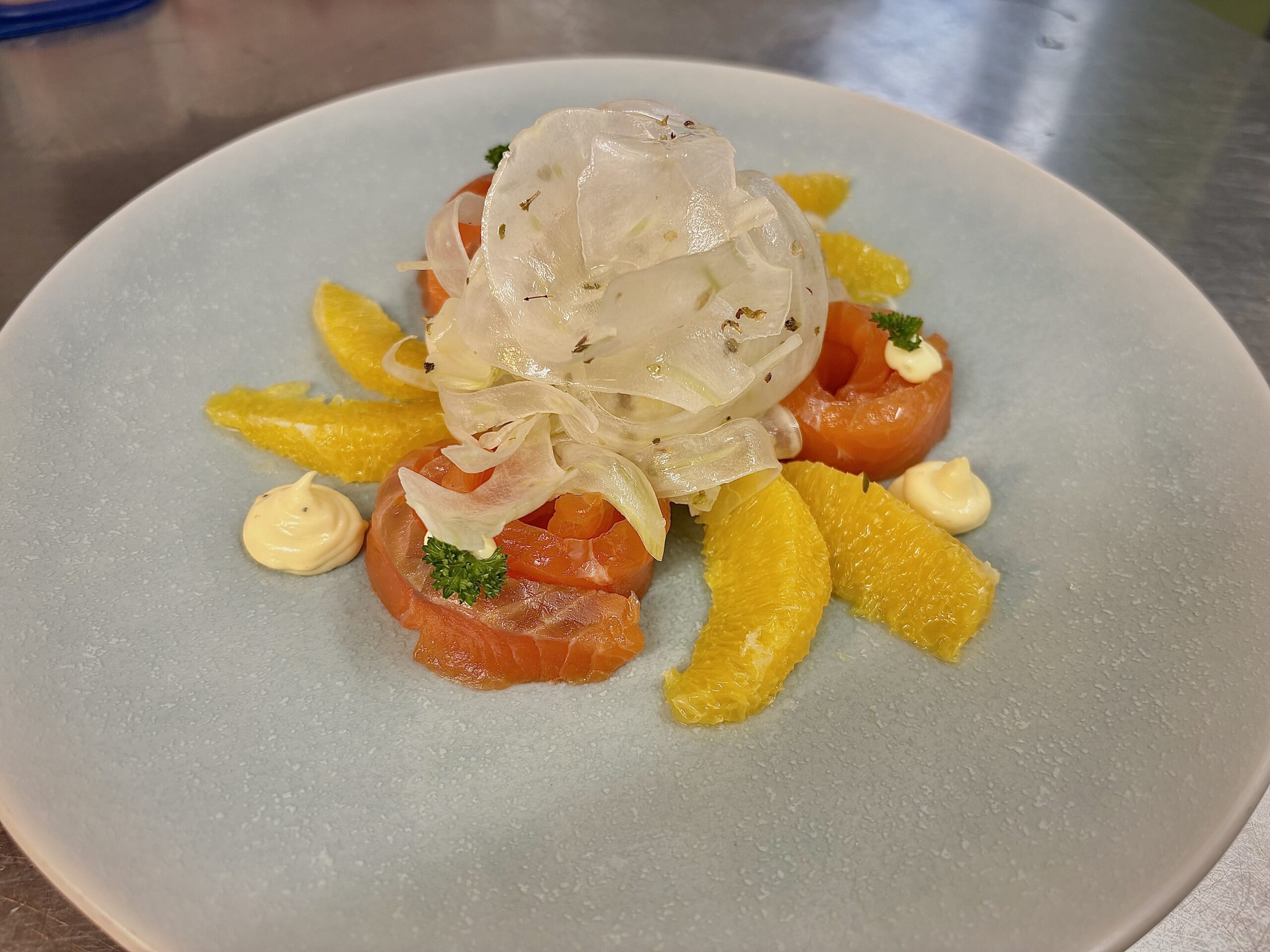 Saumon mariné aux agrumes, saladine sicilienne et mayonnaise parfumée à la lime